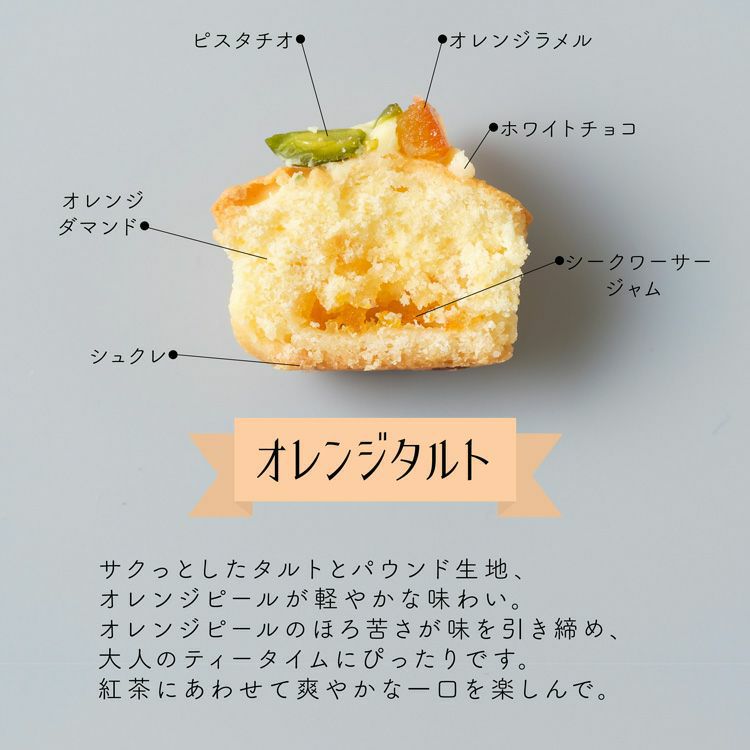 サクっとしたタルトとパウンド生地、オレンジピールが軽やかな味わい。