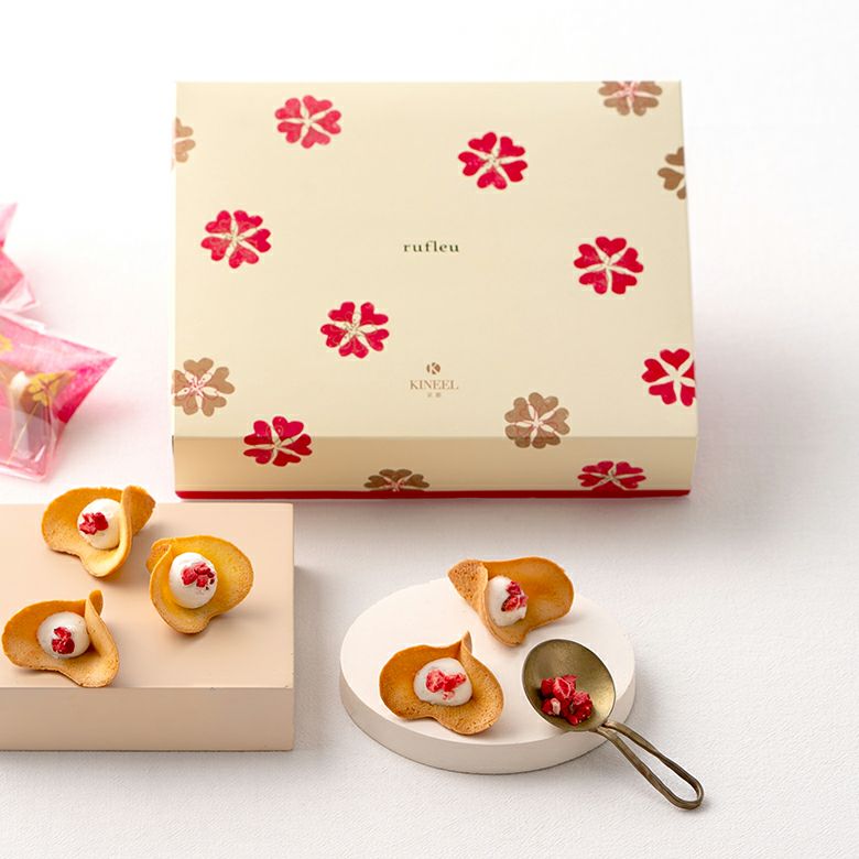 お花のかたちのかわいいラングドシャの中に、ふんわりとしたクリームをはさんだ『ルフル』。KINEELで一番人気の商品です。