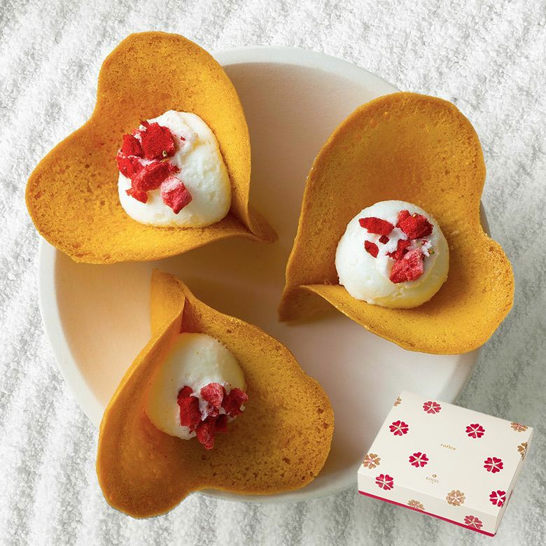 ルフル(バニラ)花びらの形のかわいいラングドシャに、ふんわりくちどけのバニラクリームをはさんだルフル。甘酸っぱいいちごがキュートな贈り物に彩を添える京都から贈る花束スイーツ。 -