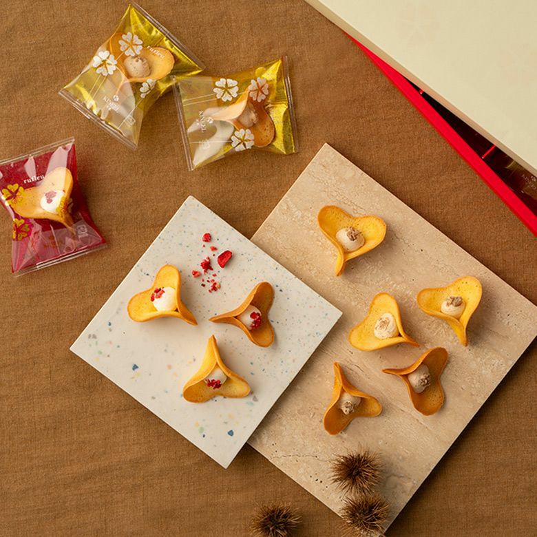 職人の手作りで仕上げられた花びら形のラングドシャに、ふんわりクリームを手絞りでそっと添えました。