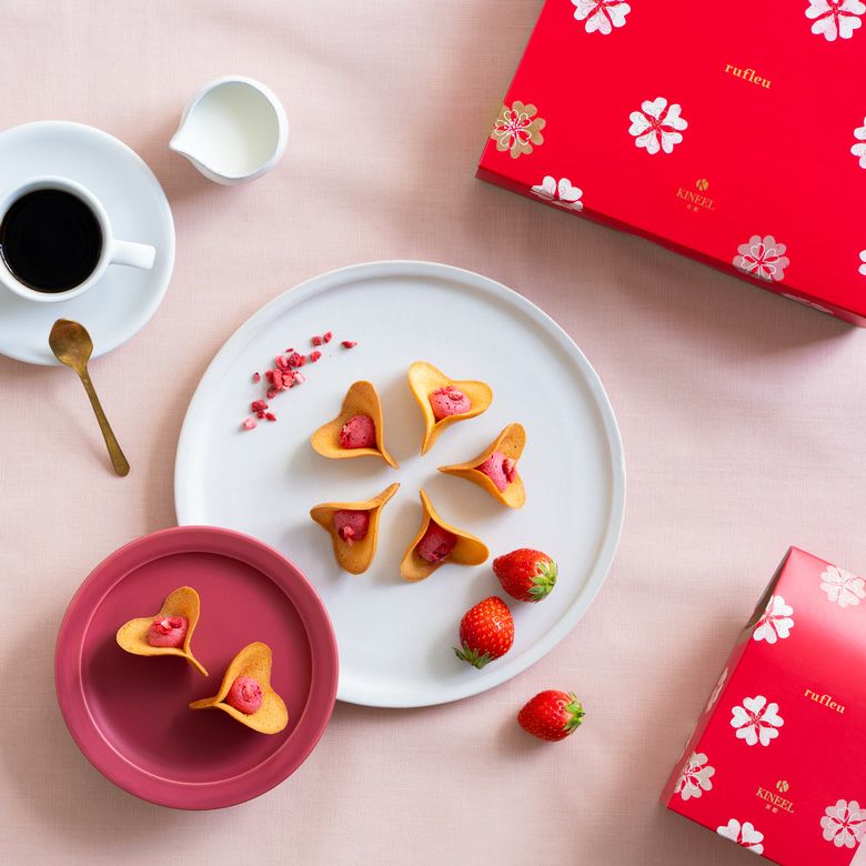 職人の手作りで仕上げられた花びら形のラングドシャに、ふんわりクリームを手絞りでそっと添えました。