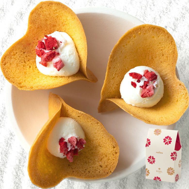 お花のかたちのかわいいラングドシャの中に、ふんわりとしたクリームをはさんだ『ルフル』。KINEELで一番人気の商品です。