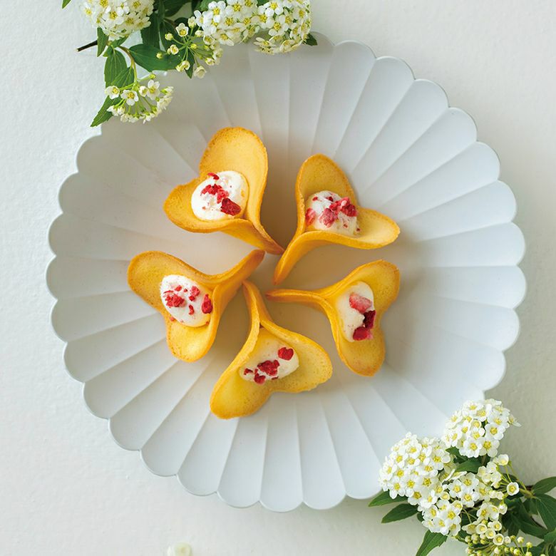 職人の手作りで仕上げられた花びら形のラングドシャに、ふんわりクリームを手絞りでそっと添えました。