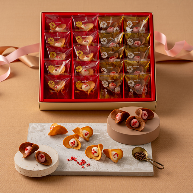 ココアをまぜこんだサクサクのラングドシャ生地に、苺とラズベリーをミックスしたみずみずしい甘い香りがふわっと広がるクリームを合わせました。